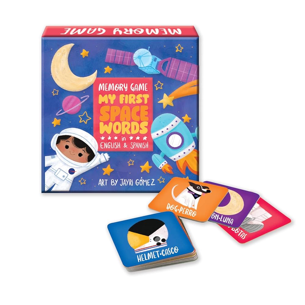 Space, telescopes, missions, and UFOs – your first glossary of space words have transformed into an out of this world memory game! Get ready to have fun, mix and match space-themed pieces alongside its bilingual English-Spanish board book companion, My First Space Words in English and Spanish! The perfect game set to slip into your bag and take with you on the go.